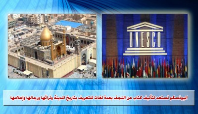 تستعد منظمة الأمم المتحدة اليونسكو للتربية والعلم والثقافة العالمية فرع العراق وبالاتفاق مع وزارة الثقافة لإعداد كتاب عن محافظة النجف الاشرف يتكلم عن تاريخها وتراثها ورجالها وإعلامها وبعد لغات لما لهذه المدينة من بعد عالمي كونها تضم مرقد الإمام علي بن أبي طالب (عليهما السلام ) والحوزة العلمية .