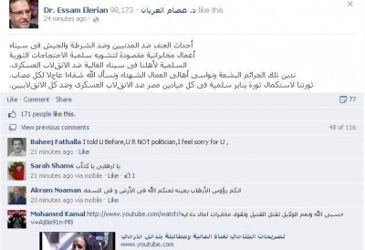 فيما استنكر نشطاء على الفيسبوك كلام عصام سلطان ووضعوا له فيديو الدكتور محمد البلتاجى الذى أكد فيه أن العمليات فى سيناء ستنتهى بمجرد رجوع الدكتور محمد مرسى إلى سُدة الحكم.