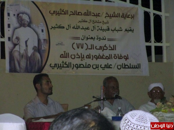 احتضنت مدينة سيئون حاضرة وادي حضرموت ندوة ثقافية لكوكبة من الأدباء والمثقفين البارزين في مقدمتهم العلامة والمؤرخ البارز السيد جعفر بن محمد السقاف والعلامة هاشم بن عبد القادر الحبشي رئيس جمعية علماء حضرموت وسط حضور كبير من سكان مدينة سيئون في فناء فندق سيئون بلازا مساء أمس الأثنين 15 يوليو 2013م نظمها ملتقى شباب آل كثير برعاية الشيخ عبدالله بن صالح الكثيري بمناسبة الذكرى الـ (77) لوفاة السلطان علي بن منصور الكثيري " احد أبرز سلاطين دولة