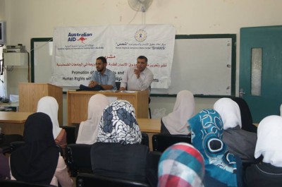 عقد مركز إعلام حقوق الإنسان والديمقراطية "شمس" ورشة عمل في كلية الشريعة بجامعة النجاح الوطنية حول اتفاقية مناهضة التعذيب ،وقد افتتح الورشة إبراهيم العبد من مركز "شمس" معرفاً بالمركز وبالمشروع وبنشاطاته وقال أن هذه الورشة هي إحدى نشاطات مشروع نشر وتعزيز مفاهيم حقوق الإنسان الذي ينفذه المركز بدعم وتمويل من الوكالة الاسترالية للتنمية الدولية.
