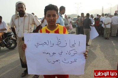 أحمد العيسي ومحافظ حضرموت شركاء في جريمة تلوث بحرنا ، هكذا حمل المحتجون في مدينة المكلا اليوم لافتات تتهم رئيس إتحاد كرة القدم والمتنفذ اليمني أحمد العيسي ومحافظ حضرموت خالد الديني بالمسؤولية التامة عن ماحدث من تلوث لمياة