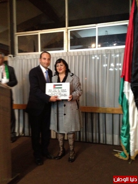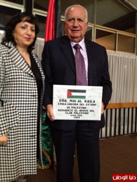 أما على الصعيد الرسمي كرمت وزراة الخارجية التشيلانية ممثله بمعالي وزير الخارجية السيد الفريدو مورينو بحضور عدد من أعيان الجالية واعضاء السلك الدبلوماسي المعتمد لدى تشيلي د. الكيلة و تم خلال حفل الغداء منحها وسام الإستحقاق والشرف التشيلي الذي يمنح للأجانب كأول شخضية فلسطينية تحظى به من جمهورية تشيلي كان إحتفالاُ رائعاً وله مدلولات سياسية أبرزها انه نعم أصبح لنا دولة، وفلسطين التي يسعى لطمسها وتهويدها الإحتلال عادت الى سابق عهدها على الخريطة السياسية شاء من شاء وابى من ابى.