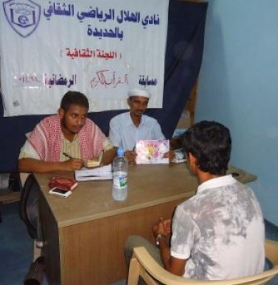 تبدأ اليوم الخميس 9رمضان المبارك المسابقة الثقافية للأندية والفرق الشعبية والمؤسسات والمبادرات الشبابية بنادي الهلال الرياضي والثقافي الإجتماعي بالحديدة وبمشاركة (15فريقاً ) وتقام المسابقة بمقر النادي الذي تشهد إقبال جماهيري على النادي خلال ليال رمضان المبارك ويشارك في المسابقة الفرق