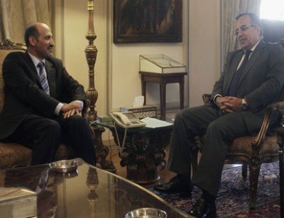 وردا على سؤال حول مشاركة سوريين في تظاهرات تنظمها جماعة الاخوان المسلمين في مصر، قال فهمي ان أى اعمال “من جانب طرف او آخر لا تمثل الشعب السورى بأكمله او حتى الائتلاف وسيتم معالجتها باعتبارها حالات فردية مستقلة عن القضية السورية”. وشدد وزير الخارجية المصري على ان بلاده “لا زالت تؤيد الحل السياسى وتأمل ان يتحقق ذلك من خلال اجتماع جنيف ? او اى وسيلة سياسية اخرى ولكن هذا هو المتاح حاليا”. ويقوم جربا بزيارة لمصر تستغرق يومين.