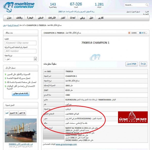 ويحتفظ الموقع الدولي المذكور، بجميع المعلومات عن جميع الناقلات النفطية البحرية، حيث أدرجنا اسم الناقلة شامبيون1 ورقمها التسلسلي، ليتبين لنا لاحقا أن بنك سبأ الإسلامي هو من مالكها الحقيقي.