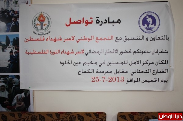 اقامت مبادرة تواصل وبالتعاون والتنسيق مع التجمع الوطني للآسر شهداء فلسطين في مركز الامل للمسنين في عين الحلوة إ فطارا رمضانياً لعائلات و اسر الشهداء وذلك يوم الخميس الموافق في 25|7|2013 حضر الافطار الى جانب اسر الشهداء اعضاء مبادرة تواصل والهيئة الادارية للتجمع الوطني لاسر شهداء فلسطين ، واعلاميين اصدقاء للتجمع وتواصل