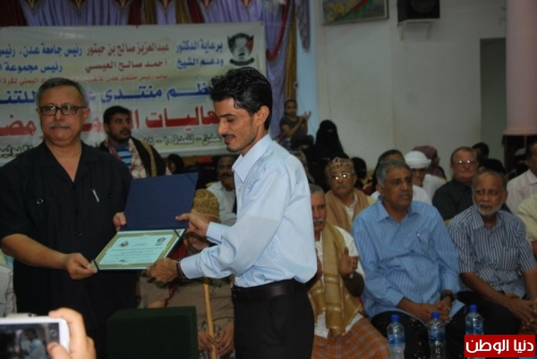 حضر حفل الختام كبار واجهات ألمحافظه ممثل بأول محافظ لمحافظة عدن بعد نيلها الاستقلال الأستاذ القدير/ ابوبكر شفيق و الدكتور/عبدالعزيز صالح بن حبتور رئيس جامعة عدن، رئيس منتدى عـدن للتنمية والدكتور/محمد الضيف نائب عميد كلية المجتمع ,عضو العلاقات ألعامه بمنتدى عدن للتنمية والأستاذ/رامي نبيه مدير عام مكتب الثقافة بمحافظة عدن والدكتور/وضاح أحمد صالح منصر المدير التنفيذي للمنتدى والأستاذ /ماجد الشاجري رئيس اتحاد منظمات المجتمع المدني عدن والدكتور /علي اليافعي عميد كلية الطب البشري بجامعة عدن وأعضاء المنتدى ومندوبين المجلس المحلي بمحافظة عدن