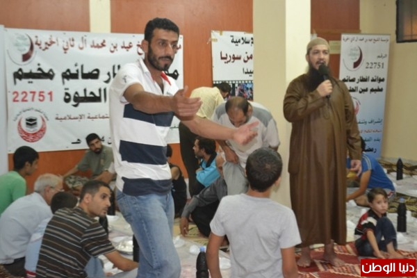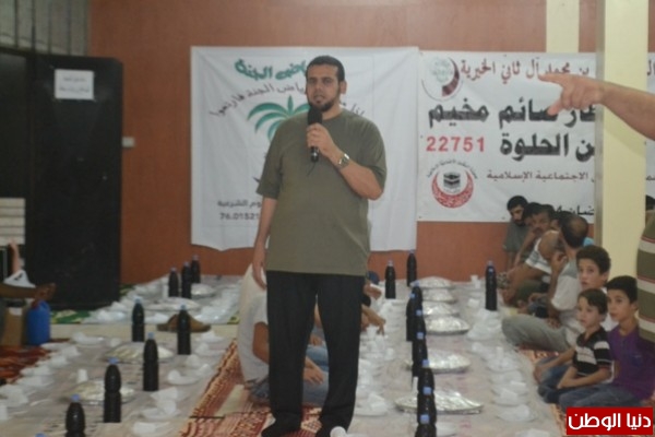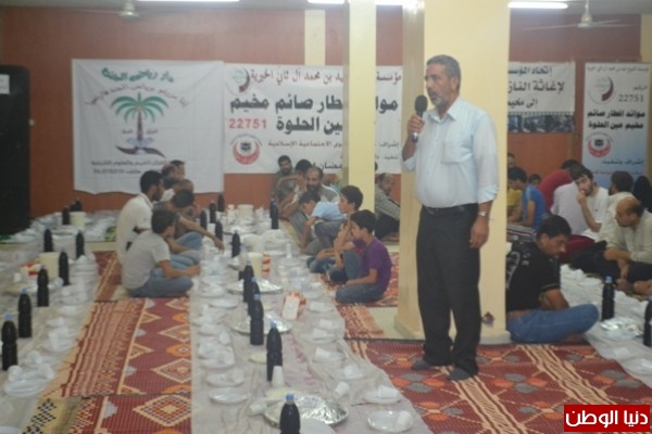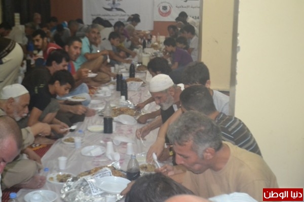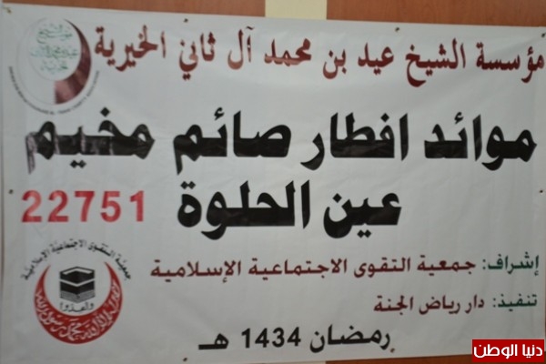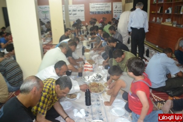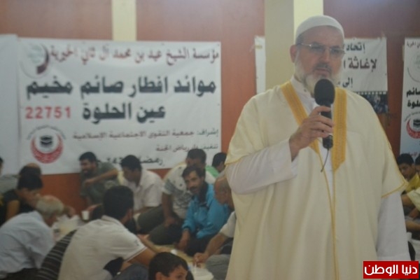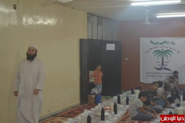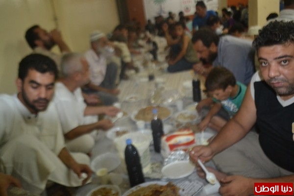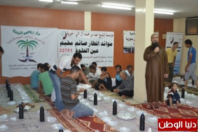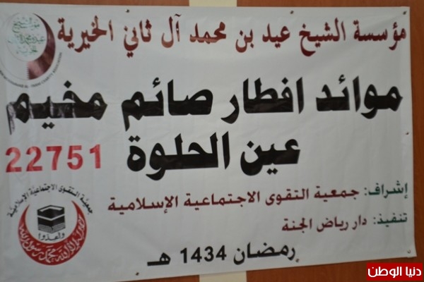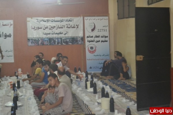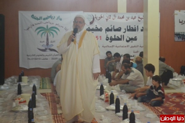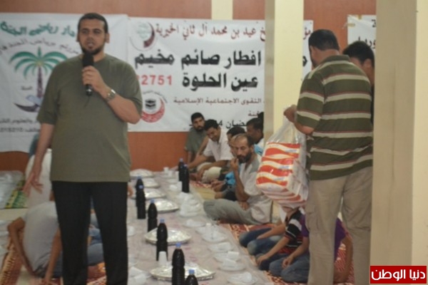 بدعم و تمويل من مؤسسة الشيخ عيد بن محمد ال الثاني الخيرية و تنفيذ و اشراف اتحاد المؤسسات الاسلامية في مخيم عين الحلوة اقيم افطار رمضاني في مسجد زين العابدين لخمسمائة شخص من النازحيين و الاهالي في خطوة وصفها الشيخ ابو شريف عقل ممثل عصبة الانصار الاسلامية انها للتلاقي و تعزيز اواصر الاخوة بين الاخوة النازحيين و اهالي المخيم , هذا و اكد شيخ مخيم عين الحلوة الشيخ جمال خطاب على صعوبة الوضع المعيشي للاخوة النازحيين في ظل تخلي الجميع عنهم في الوقت الراهن , بينما وعد ممثل حركة حماس و مدير جمعية الفرقان الاخ ابو حسام زعيتر النازحيين بالعمل المستمر لتأمين ما امكن من احتياجات مشددا ان حركة حماس لن تتخلى عن واجبها تجاه النازحيين .