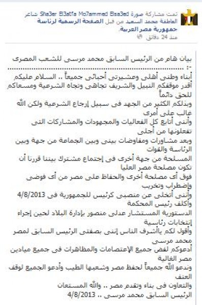 تداول نشطاء على موقع"فيس بوك" بيان منسوب للرئيس المعزول "محمد مرسي" يطالب فيه أنصاره بفض الإعتصامات.