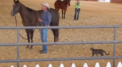 أفسدت قطة محاولات صاحب أحد الخيول في احد المزادات العلنية لبيع حصانه عندما قفزت على الحصان وهاجمته بطريقة مفاجئة ما جعله يركض من مكانه.