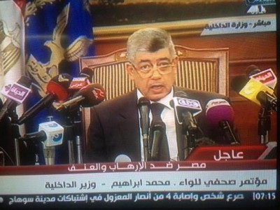 أوضح وزير الداخلية المصري محمد إبراهيم في مؤتمر صحفي صباح هذا اليوم الخميس 15-8-2013 والذي بدأ في تمام الساعة السابعة صباحا بالقول "أنا أعد أنه بمجرد أن تستقر الأحوال ويستقر الشارع المصرى فى أقرب وقت ممكن سوف يتم إعادة الأمن لهذا الوطن كما كان قبل 25 يناير وأكثر".