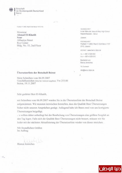 وبعد صدور هذا القرار فتحت امامي ابواب القًدر وفي عام 2007 قمت بتعليم دروات اللغة الالمانية والترجمه وتخليص جميع المعاملات التي تختص بالسفارة الالمانية في معهد على طريق البرج الشمالي مقابل مشروع الاصلاح .