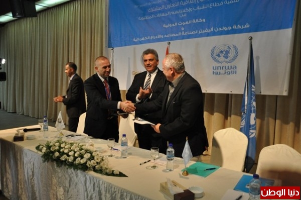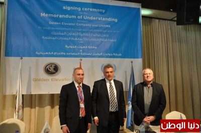 وقع برنامج التعليم في وكالة الأمم المتحدة لإغاثة وتشغيل لاجئي فلسطين في الشرق الأدنى (الأونروا) اليوم إتفاقية تعاون مشترك مع شركة جولدن إليفيتر لصناعة المصاعد والأدراج الكهربائية والتي من أهدافها تحسين فرص التدريب والتوظيف للطلاب الشباب اللاجئين الذين يدرسون في معهد قلنديا للتدريب المهني التابع للأونروا، وتعزيزقدرة برنامج التعليم في الأونروا على تطويرالتعليم المهني كأداة فعالة لمكافحة الفقر، حيث وقع هذه الإتفاقية مديرعمليات الأونروا في الضفة الغربية السيد فليبه سانشيز ومديرعام شركة جولدن إليفيتر السيد حسام قرش في حفل أقيم في فندق حياة نابلس، وذلك بحضورعدد من الشخصيات الوطنية والاعتبارية وممثلين عن القطاع الخاص. تهدف هذه الإتفاقية إلى تحسين وتطوير التدريب في الدورات المهنية التي يقدمها معهد قلنديا لطلابه في مجال صيانة المصاعد الكهربائية، بهدف إكسابهم المهارات المطلوبة لسوق العمل وذلك لزيادة فرص التوظيف للخريجين مباشرةً بعد تخرجهم.
