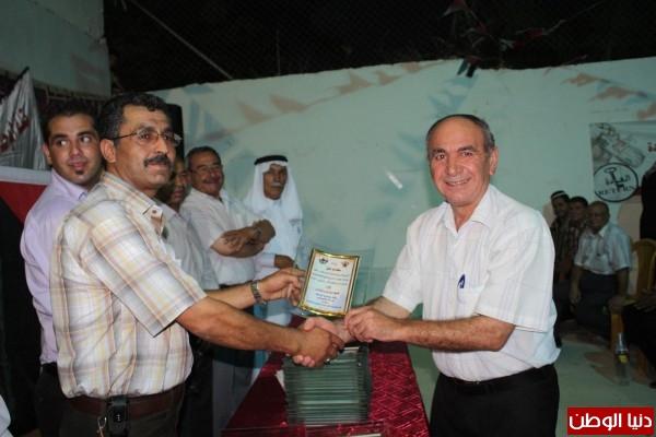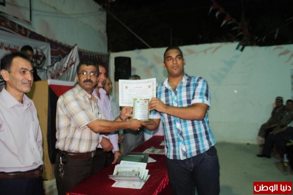 في نهاية الحفل قام كلا من الرفيق رمزي رباح وجمال رجوب محمد جلايطة والأستاذ محمد الحواش والرفيق صلاح السمهوري وإسماعيل ابو داهوك ومصطفى عوضات و صباح الشريف و مهند ابو رحمة بتوزيع الشهادات والدروع التقديرية على الخريجين والطلبة الناجحين في الثانوية العامة