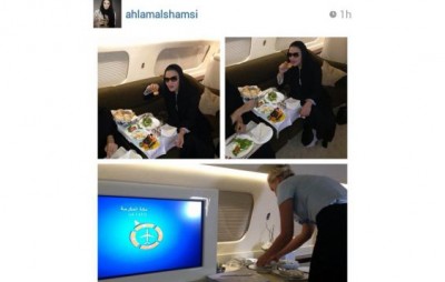 كذلك نشرت أحلام صوراً من داخل الطائرة، وهي تتناول الغداء، إلى جانب الحلوميين؛ وكان مؤلفاً من “السلمون والسّمك والحلوى الخاصّة”.