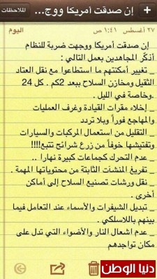 قال جهاديو سوريا "ان صدقت امريكا ووجهت ضربة للنظام السورى يتوجب على المجاهدين تغيير اماكنهم ما استطاعو مع نقل العتاد الثقيل ومخازن الاسلحة ببعد 2كم كل 24 ساعة خاصة بالليل واخلاء مقرات القيادة وغرف العمليات والمهاجع والتقليل من استعمال المركبات والسيارات وتفتيشها "