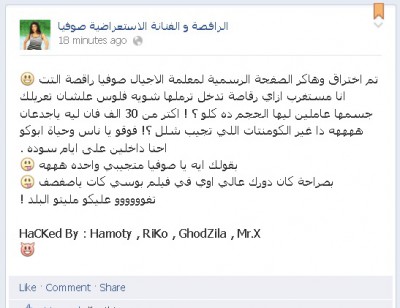 قامت منذ أقل من ساعة مجموعة من " الهكرز " باختراق الصفحة الرسمية للفنانة الاستعراضية و الراقصة صوفيا الشهيرة براقصة التت على موقع التواصل الاجتماعي فيس بوك