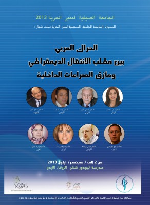 لقد تم اختيار موضوع الجامعة الصيفية لهذه السنة هذه السنة كالتالي "الحراك العربي بين مطلب الانتقال الديمقراطي ومأزق الصراعات الداخلية" حيث تعيش العديد من أقطار العالم العربي على وقع حراك مجتمعي لأزيد من سنتين دون أن تتضح معالم رؤية المستقبل بعد، بفعل عدة عوامل أبرزها العودة الواضحة لممارسات أزلام الأنظمة السابقة بغية حماية مصالحهم وإدامتها والتي تمتلك قدرة فائقة على التكيف وإعادة إنتاج نفس النسق من جهة، وتخلق وبروز قوى جديدة تحاول السيطرة على السلطة وتوجيه دفة المجتمع وفق تصورها ومنظومتها من جهة أخرى .