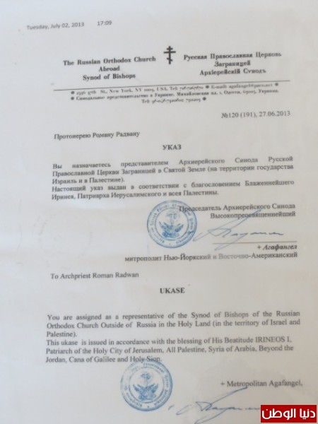 التعيين يقول كما يلي نحن نعينكم ممثلا لنا بموافقة المجمع المقدس للكنيسة الروسية في المهجر وان تزاول عملك الروحي والاجتماعي في الاراضي المقدسه وهذا بعث الفرح لأبناء الرعيه في يافه الناصره وللعديد من الرعايا الارثوذوكسيه المختلفة وأعلنوا انهم على استعداد للانضمام والاتحاد مع هذا المجمع والتنسيق معه بكل الامور الروحيه لا بل التحرر من الاضطهاد اليوناني ونحن باتجاه انفصال نهائي وتحرر كامل من البطريركية المقدسيه من اجل اكمال الرسالة الروحيه والكنسية كما ينبغي فعند المسيح لا يوجد قوميات والكاهن يقوم برسالته الروحيه منذ تعيينه وحتى الممات اي رسالته ابديه كما وان المسيح نادى بالعدل والمساواة والطاعة التي يتحدثون عنها يجب ان تكون مربوطة باطاعه الله وتعاليمه وخدمه الرب فلا يجوز ان تطيع الانسان او الرئيس على مزاجه بل تطيعه من اجل الرسالة التي يحملها بحسب تعاليم الله فمذكور ايها العبيد اطيعوا في كل شيء اسيادكم حسب الجسد لا بخدمه العين كمن يرضي الناس بل ببساطه القلب خائفين الرب وقال بولس الرسول برسالته ايها السادة قدموا للعبيد العدل والمساواة عالمين ان لكم انتم ايضا سيد في السماوات ولذلك يجب ان لا يتفاخر احد بسلطته من اجل البطش بالآخرين والاستبداد والإجحاف وإنما عليه ان يعرف ان له رب فوقه وسيد في السماوات وعليه الطاعة وهو فقط اله وأداه من اجل ايصال الكلمه والرسالة فموافقين نحن ان نكون عبيد ولكن قدموا لنا العدل والمساواة وأين بطريركيتنا وأخويه القبر المقدس والبطريرك ثيوفيلوس من العدل والمساواة التي يطالبنا فيها الرب وعلى ذلك نطالبهم بالا جابه .