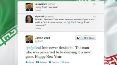 وتابع: قال روحاني في تغريدته: "في الوقت الذي تغرب فيه الشمس هنا في طهران، فإنني أود أن أتمنى لكل اليهود، وخاصة أولئك الذين يعيشون في إيران، رأس سنة مبارك"، ونشر إلى جانب التهنئة صورة ليهودي إيراني يصلي في كنيس بطهران، لكن محمد رضا صادق، المستشار الإعلامي للرئيس الإيراني، نفى التغريدة الرئاسية، وقال إن روحاني ليس له أي حساب في "تويتر". أما تغريدة ظريف فلم ينفها أي مصدر إيراني، خصوصاً هو شخصياً.
