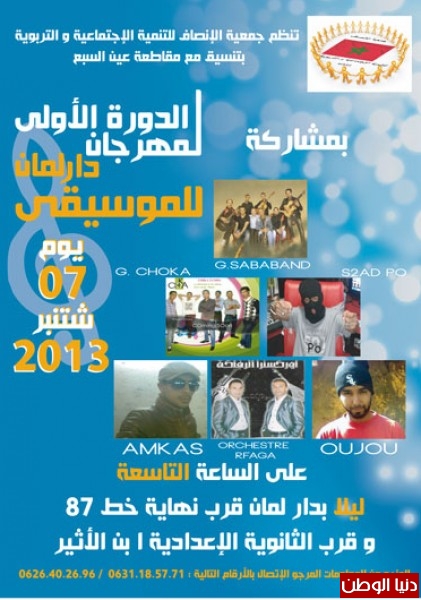 تستعد جمعية الإنصاف للتنمية الاجتماعية و التربوية بالشباب لتنظيم مهرجان دار لمان للموسيقى في دورته الأولى بتنسيق مع مقاطعة عين السبع و الإئتلاف الجمعوي لجهة الدار البيضاء الكبرى وفي بلاغ توصل الموقع بنسخة منه أن هذا المهرجان سيكون مفتوح في وجه الطاقات المحلية لتشجيع شباب المنطقة المهتمين بالأغنية الشبابية سواء الفردي أو المجموعات و يأتي هذا المهرجان في ظل الأعمال و الأهداف التي تسطرها جمعيتنا.