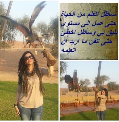 وظهرت في الصورة تلاعب صقر كبير، وعلقت على الصورة: “سأظل أتعلم من الحياة حتى أصل إلى مستوى يليق بي وسأظل أخطئ حتى أتقن ما أريد أن أتعلمه”.
