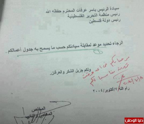 توضح الصورة كتاب مقدم من محامى للرمز أبو عمار تعود لعام 2004 يطلب الأول من الرئيس تحدد لقاء لزيارته .