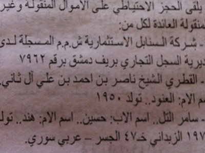 الحجز على أموال الشيخ القطري ناصر آل ثاني وشركته في سورية