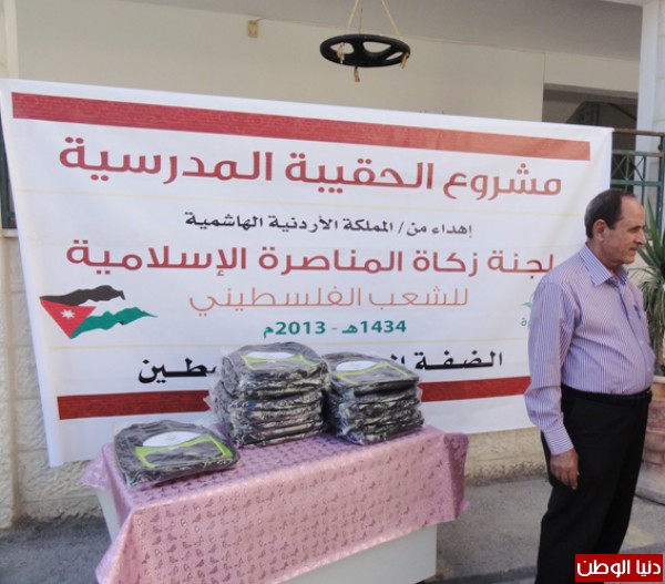 قام نائب مدير تربية طولكرم الإداري ساجي القبج ورئيس لجنة زكاة طولكرم الحاج غازي الحج قاسم بتوزيع حقائب مدرسية على الفقراء والمحتاجين والايتام في مدارس بنات فاطمة الزهراء ومدارس الإسراء وإنشراح الددو لأكثر من 170 طالب وطالبة في المرحلة الأولى ضمن مشروع الحقيبة المدرسية والمهداه من المملكة الأردنية الهاشمية - لجنة زكاة المناصرة الإسلامية للشعب الفلسطيني.