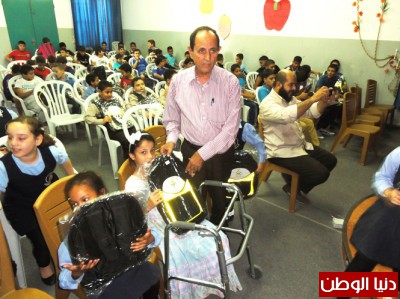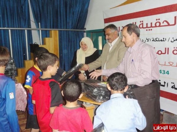 وقد قام القبج والحاج غازي بتسليم الحقائب وسط فرحة بين الطلبة .