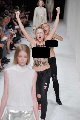 والعاريتان الاوكرانيتان كتبتا على جسميهما العاريين “العارضة لا تذهب إلى بيوت الدعارة” و ” ديكتاتورية الموضة “.