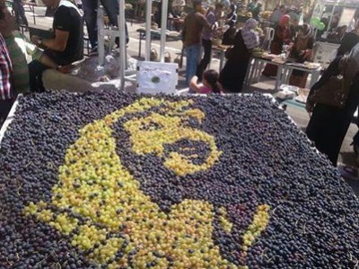 في مهرجان عنب الخليل والذي افتتحه رئيس الوزراء الدكتور رامي الحمدلله زين بعض المزارعين منتوجاتهم بصورة لابو عمار وسط المعرض ..