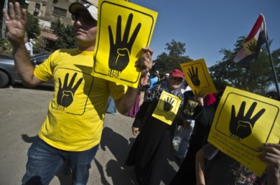 تجمع العشرات من أنصار الرئيس المعزول محمد مرسي، مساء اليوم الثلاثاء في ميدان التحرير وسط القاهرة، رافعين صورا عليها علامة "رابعة".