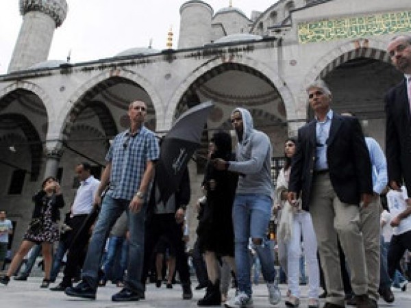 مادونا متحجبة خارجة مع ابراهيم من مسجد السلطان أحمد باسطنبول