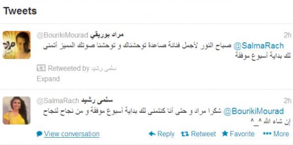 تبادل النجمان المغربيان، سلمى رشيد ومراد بوريقي، التغريدات على موقع التواصل الاجتماعي، "تويتر"، اليوم .