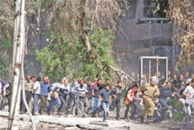 ولكن المكان هذه المرة لم يكن في فلسطين المحتلة باتجاه حاجز للاحتلال الإسرائيلي في مدينة القدس أو في قرية بلعين خلال مسيرتها الأسبوعية ضد الجدار العازل، هذه المرة كانت التظاهرة في مخيم اليرموك للاجئين الفلسطينيين القابع تحت الحصار في المنطقة الجنوبية للعاصمة دمشق.