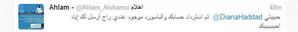 وبعد دوشة أحدثها عبر موقع التويتر حيث تعرّض لهجوم كبير من عشاق ديانا الذين دافعو عن البرينسيسه، أعلنت نجمة الخليج أحلام عن إسترجاعها للحساب، فتوجهت إلى ديانا بتغريدة تعلمها فيها أنها سترسل لها كلمة المرور حتى تتمكن من التغريد من جديد.