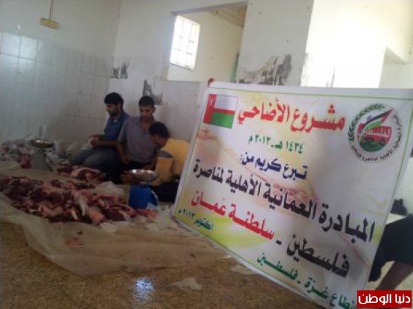 أنهت المبادرة العُمانية الأهلية لمناصرة فلسطين ، تنفيذ مشروع الأضاحي لهذا العام 1434هــ بتوزيع أكثر من 1300 حصة من لحوم الأضاحي على الأسر الفقيرة والأيتام في جميع مناطق قطاع غزة .