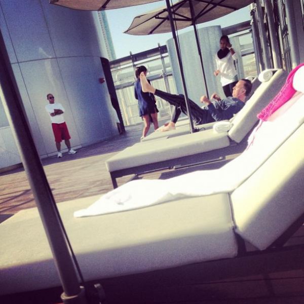 كما نشرت حسون منذ بعض الوقت صورة للمسبح في برج خليفة-دبي، وظهر فيها الفنان العالمي خوليو إغليسياس، وعلقت عليها بالقول "شوفوا مين عم يتسمّر حدّي.. خوليو إغليسياس ما عم صدّق".