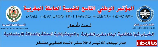 تعقد الشبيبة العاملة المغربية مؤتمرها الوطني التاسع يوم 2 نونبر 2013 تحت شعار: " الشباب قوة طلائعية لبناء مغرب الكرامة و الديمقراطية الحقة و العدالة الاجتماعية " بقاعة فلسطين بالمقر المركزي للاتحاد المغربي للشغل بالدار البيضاء ، بحضور أزيد من 850 مؤتمر و مؤتمرة. و ستعرف الجلسة الافتتاحية للمؤتمر حضور ضيوف من منظمات نقابية عربية، افريقية و دولية صديقة بالإضافة الى تنظيمات شبابية و أحزاب سياسية صديقة من داخل المغرب . و سيتم خلال هذا المؤتمر انتخاب الأجهزة و الهياكل التنظيمية للشبيبة العاملة.