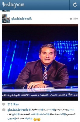 في اول تعليق للفنانة المصرية غادة عبد الرازق على حلقة الفنان الساخر باسم يوسف , قالت الفنانة على صفحتها على تويتر موجهة تعليقها لباسم يوسف "لباسم يوسف , واضح انك غيران من الفريق السيسي لانه سرق منك المشهد وقلب المصريين , واضح اوي اقولك .. هاردلك حبيبي"