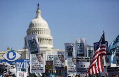وحمل المحتجون لافتات كتبوا عليها "اوقفوا عمليات التجسس" و "شكرا لك يا ادوارد سنودن" اثناء تجمعهم امام مبنى الكونجرس للتظاهر ضد عمليات المراقبة عبر الانترنت التي قامت بها وكالة الأمن القومي الأميركي.