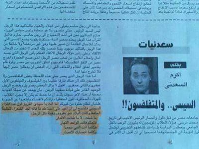 وأثار المقال الذي نشره الكاتب الصحفي أكرم السعدني بعنوان “السيسي والمتفلسفون” موجة انتقادات حادة من جانب نشطاء سياسيين، ورواد مواقع التواصل الاجتماعي، احتجاجا على قوله في نهاية مقاله “البعض يصر بل وينصح الرجل الوحيد القادر على قيادة سفينة الوطن بأن يبتعد عن عجلة القيادة، بحجة أن هذا الأمر سوف يثبت أن ما حدث انقلاب أقول لهؤلاء.. احتفظوا بآرائكم لأنفسكم وابتعدوا عن الصورة، أما أنت يا سيدي الفريق أول عبد الفتاح السيسي فاسمح لي أن أعيد علي أسماعك ما قاله أحد الشعراء: