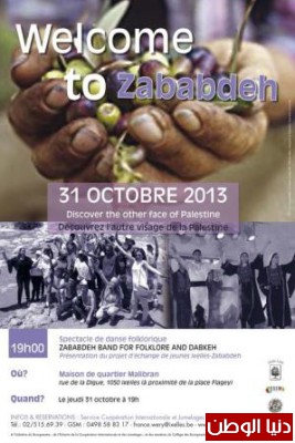 وصل وفد بلدية الزبابدة برئاسة المهندس مطيع دعيبس وعضوية سامي إبراهيم ومروان دعيبس وقاسم تركمان إلى مدينة اكسل البلجيكية من مدينة شيسترنينو الايطالية للاحتفال بمرور عشرة أعوام على توقيع اتفاقية التوأمة بين البلديتين وسيشارك في هذا الاحتفال عطوفة محافظ جنين اللواء طلال دويكات ود. سامر الأحمد مدير الإغاثة الزراعية فرع الشمال وفرقة الزبابدة للدبكة والفنون الشعبية الذين غادروا إلى عمان بطريقهم إلى بلجيكا.