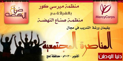 ونفذّت منظمة صناع النهضة برنامج المناصرة المجتمعية في محافظة لحج بالشراكة مع منظمة مرسي كور بعد شهر من المرحلة الأولى ضمن مشروع "التمكين والمشاركة الشبابية "سعياً لتوفير مناخ سليم وتذليل الصعوبات التي تواجه الشباب في طريقهم لإدارة قضايا مجتمعاتهم .