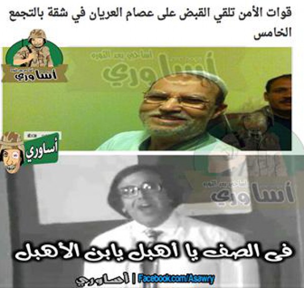 سخرت عدد من صفحات موقع التواصل الاجتماعي "فيس بوك"، من القيادي الإخواني عصام العريان، نائب رئيس حزب الحرية والعدالة، بعد إلقاء القبض عليه.