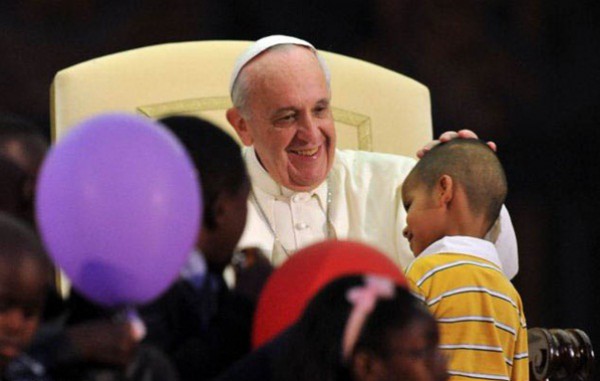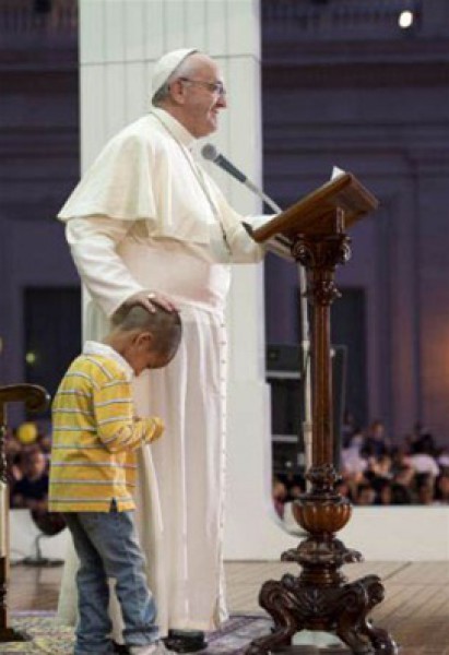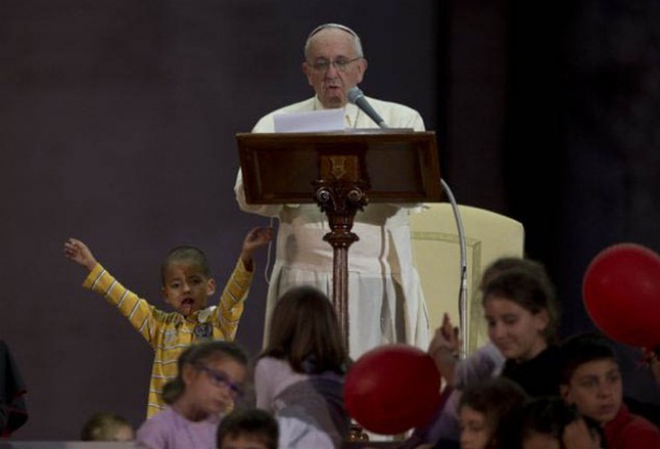 فاجأ طفل صغير بابا الفاتيكان بالصعود على المسرح الذي كان يجلس عليه، وأخذ يداعبه بنظرات وحركات مضحكة ليخطف منه الأضواء أمام الألاف من الجماهير التي كانت موجودة للاستماع لكلمة البابا في ساحة “سان بيتر”.