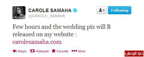 ثم نشرت أول صورة لحفل زواجها وتألقت بفستان أبيض من تصميم المصمم العالمي زهير مراد , وبدت كارول سعيدة وجميلة.