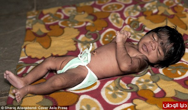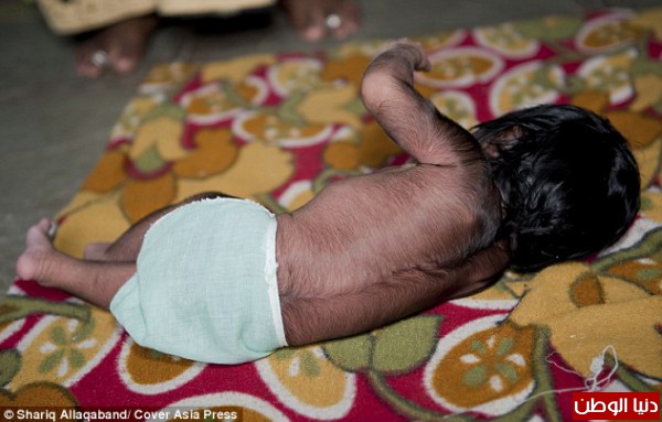 والطفلة التي تبلغ من العمر22 يوما ولم يطلق عليها اسم بعد , مغطاة بالشعر من رأسها حتى أخمص قدميها حيث ورثت عن عائلتها جين نادر تسبب لها بمتلازمة الذئب.