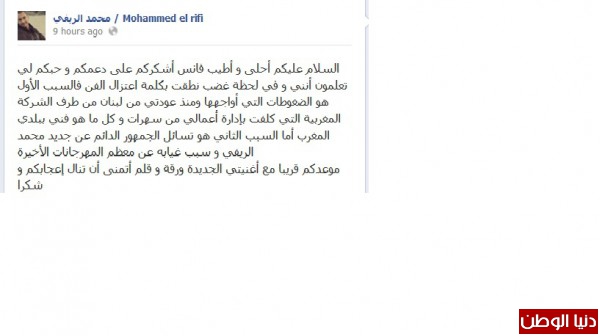 فقد كتب نجم اكس فاكتور عبر صفحته على الفيس أن هذه الكلمة صدرت منه في لحظة غضب ووضح أن السبب هي ضغوطات التي واجهها منذ عودته إلى المغرب بسبب الشركة المكلفة بإدارة أعماله .